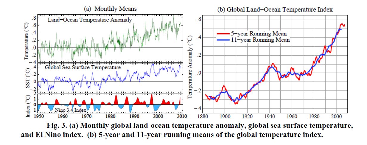 However, the 5-year and 11-year running mean global temperatures (Figure 3b) have continued to increase at nearly the same rate as in the past three decades. There is a slight downward tick at the end of the record, but even that may disappear if 2010 is a warm year. Indeed, given the continued growth of greenhouse gases and the underlying global warming trend (Figure 3b) there is a high likelihood, I would say greater than 50 percent, that 2010 will be the warmest year in the period of instrumental data. This prediction depends in part upon the continuation of the present moderate El Nino for at least several months, but that is likely.
