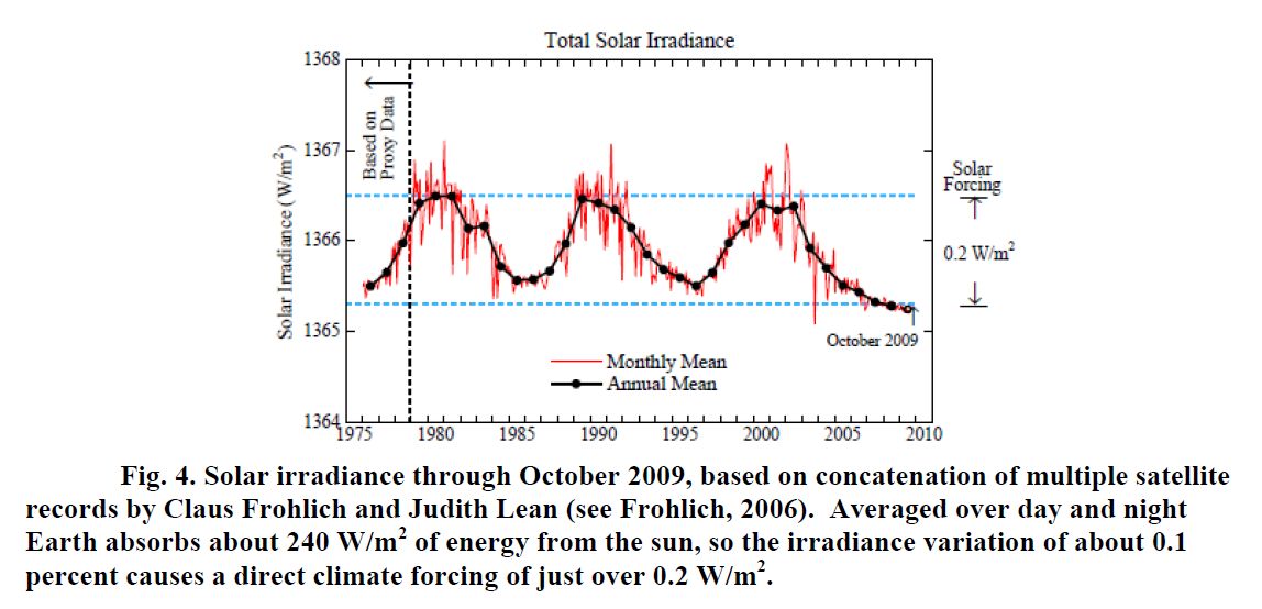 Indeed, it is likely that the sun is an important factor in climate variability. Figure 4 shows data on solar irradiance for the period of satellite measurements. We are presently in the deepest most prolonged solar minimum in the period of satellite data. It is uncertain whether the solar irradiance will rebound soon into a more-or-less normal solar cycle – or whether it might remain at a low level for decades, analogous to the Maunder Minimum, a period of few sunspots that may have been a principal cause of the Little Ice Age.
